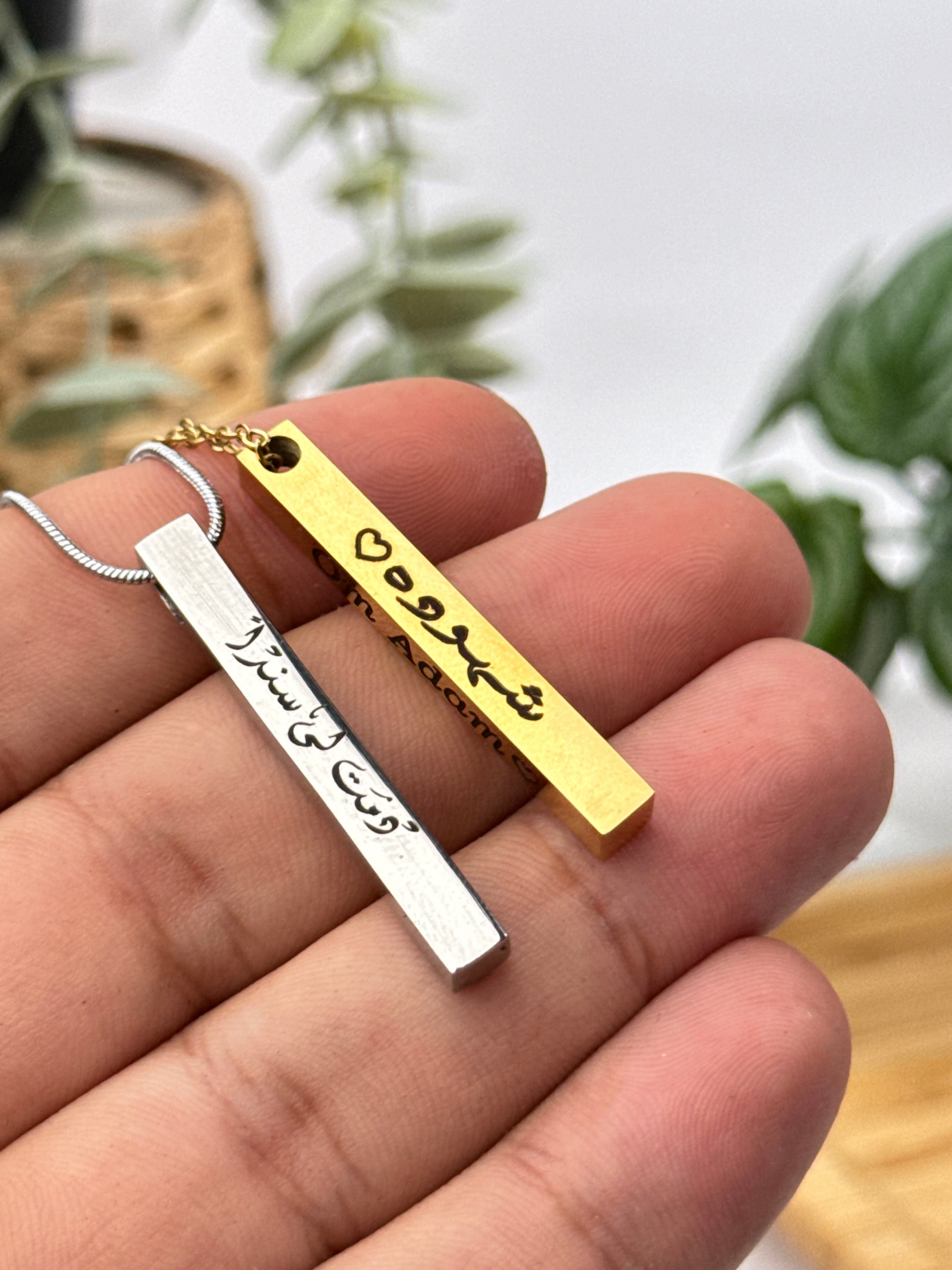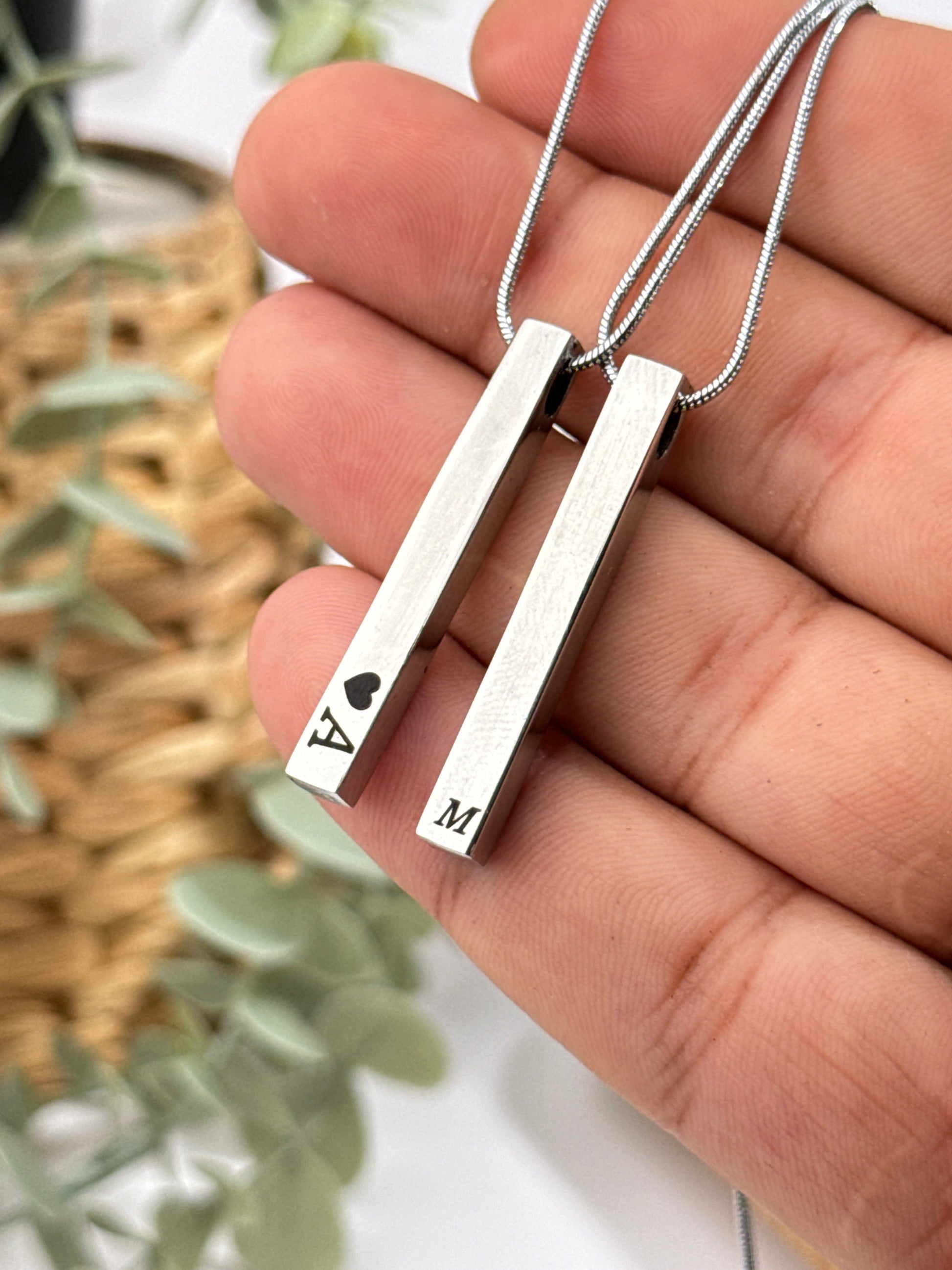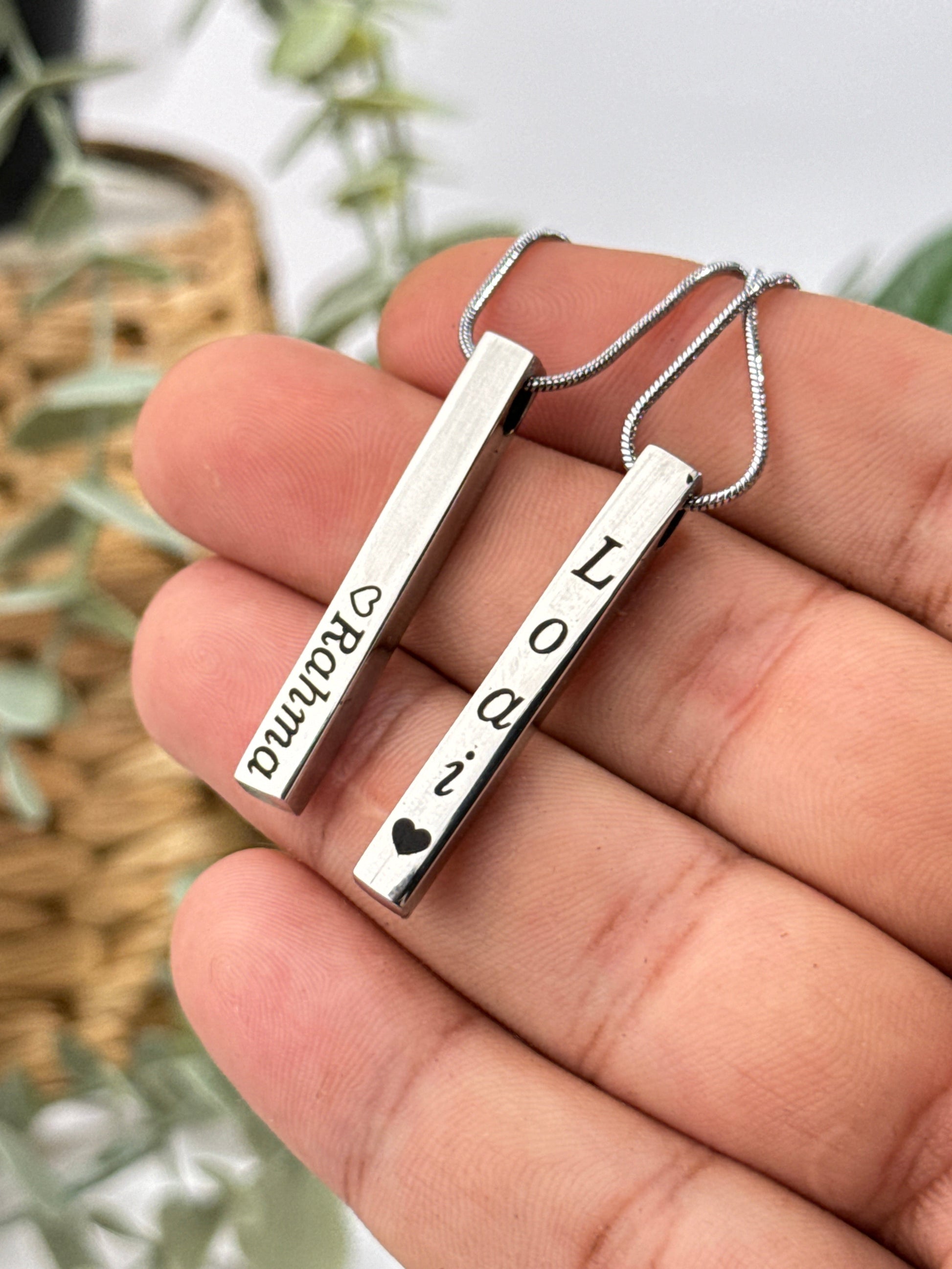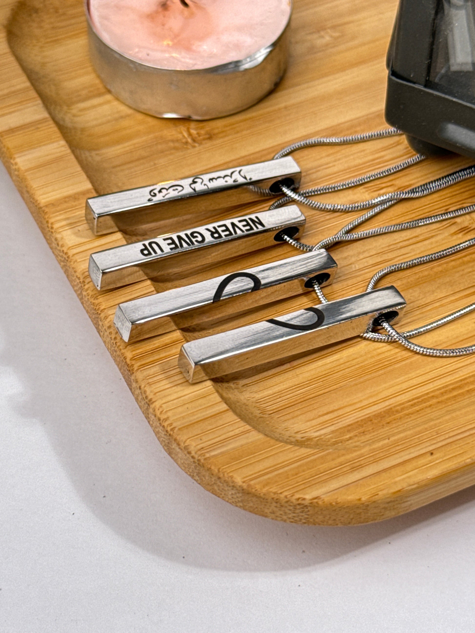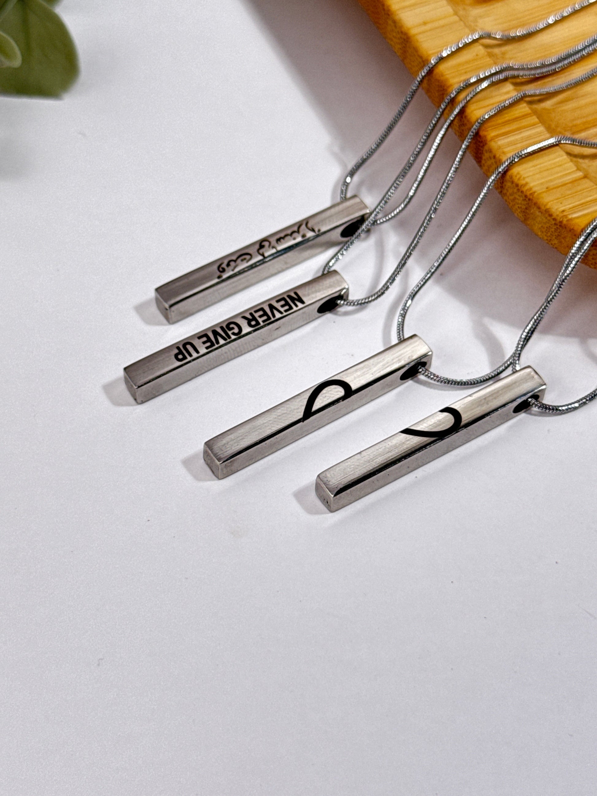 اصنع قطعتك الخاصة مع سلسلة بار ثلاثي الأبعاد بتصميم أنيق وفريد، يتيح لك نقش رسائل أو أسماء أو تواريخ مميزة على جميع الجوانب الأربعة.